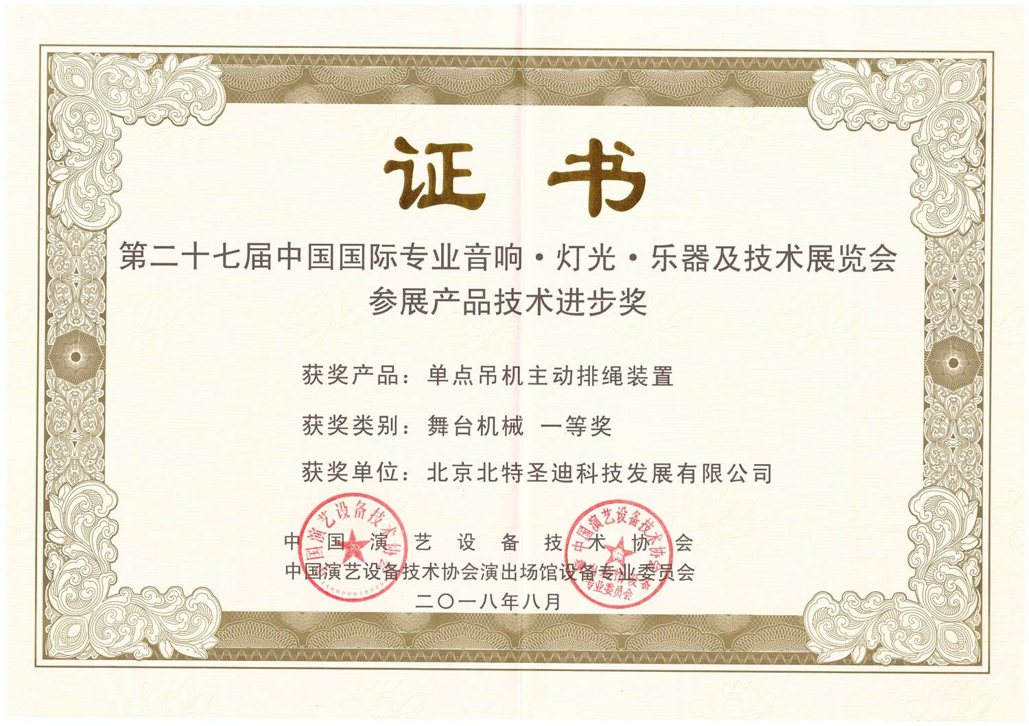 2018第二十七屆PALM展產(chǎn)品技術(shù)進步獎-單點吊機主動排繩裝置-舞臺機械一等獎