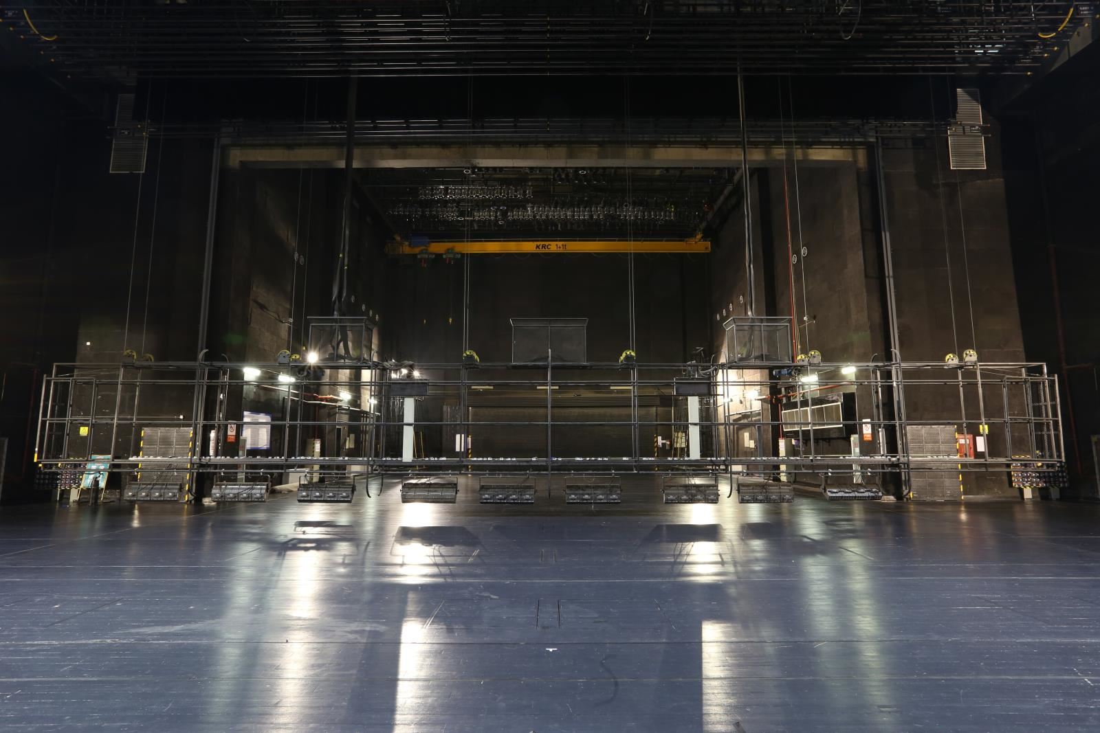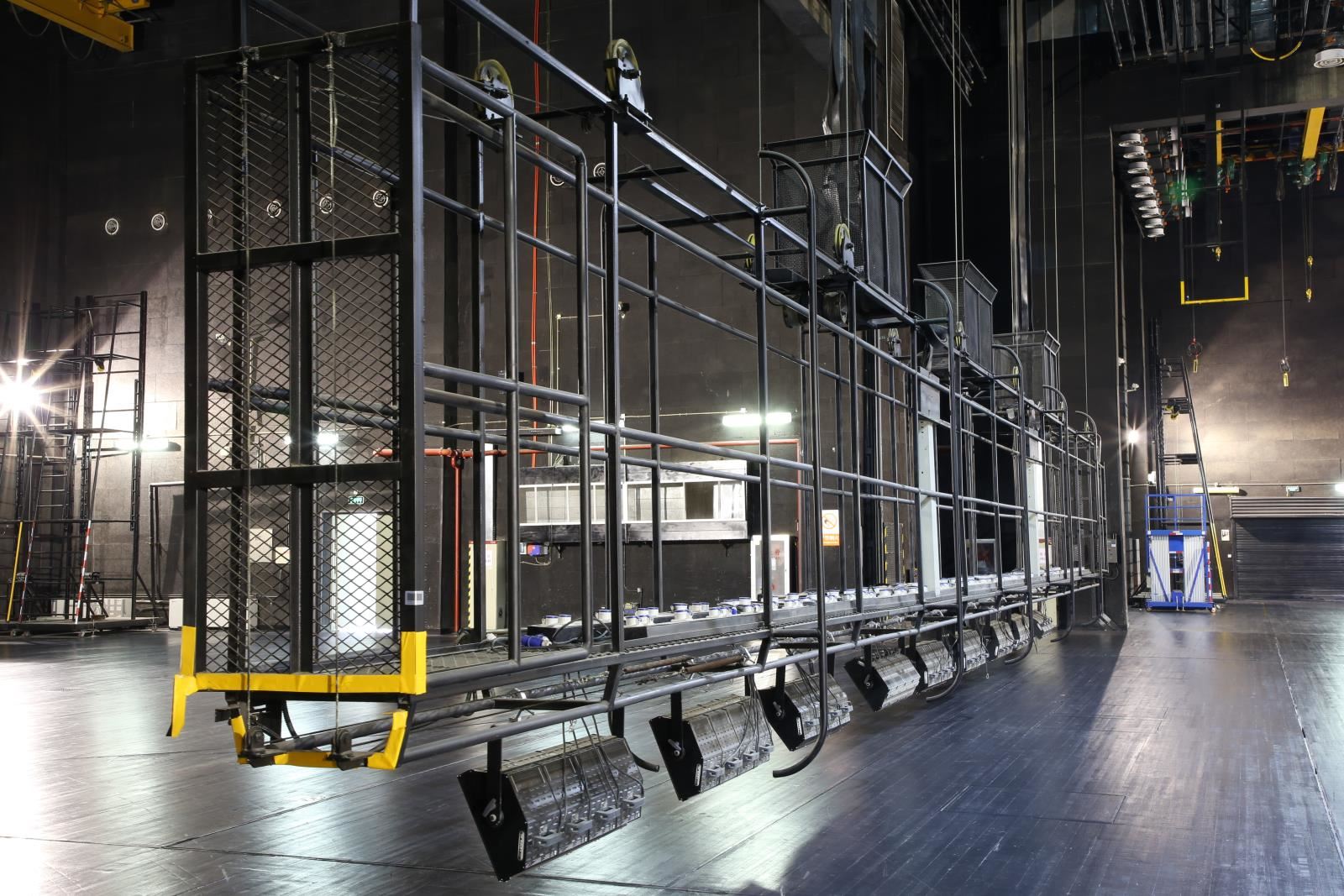 設(shè)置于主舞臺上空,用于吊掛舞臺燈具。現(xiàn)在一般較少設(shè)燈光渡橋,如設(shè),較常設(shè)在主舞臺后區(qū)(即天幕景區(qū))上空。燈光渡橋與一層天橋通過“碼頭”相連,許可2名工作人員進(jìn)入燈光渡橋工作。碼頭形式一般為翻轉(zhuǎn)式,翻轉(zhuǎn)到位后固定于天橋上。燈光渡橋的兩側(cè)設(shè)計便于安裝燈具,設(shè)電纜收納裝置。一層天橋兩側(cè)與“碼頭”對應(yīng)位置各設(shè)一道安全防護(hù)門。天幕燈光渡橋上一般鋪設(shè)5mm厚的鋼板網(wǎng)(QB/T3896-1999)TL=22mm,TB=26mm,鋼板網(wǎng)上鋪設(shè)橡膠地板,型號為天然耐磨膠板,厚度為4mm。